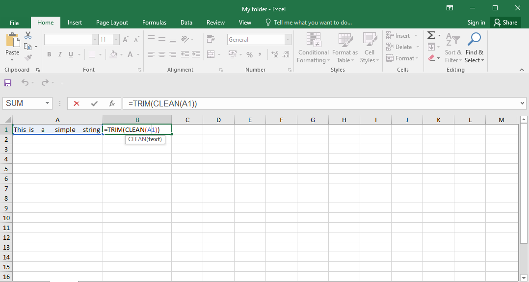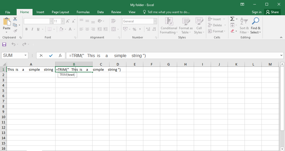 Alternativamente, para eliminar espacios adicionales de una cadena de texto directamente, puede usar la siguiente fórmula: –