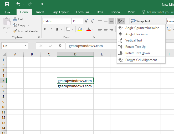 Abra una hoja de cálculo en Excel y seleccione una sola celda / varias celdas con texto. En la pestaña Inicio, haga clic en la opción Orientación en la sección Alineación.