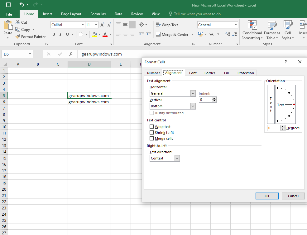 Si aún no está satisfecho con alguna alineación de texto predefinida, puede seleccionar la última opción, Dar formato a alineación de celda. Con esta opción, puede cambiar la dirección del texto y el ángulo del texto según sus necesidades.