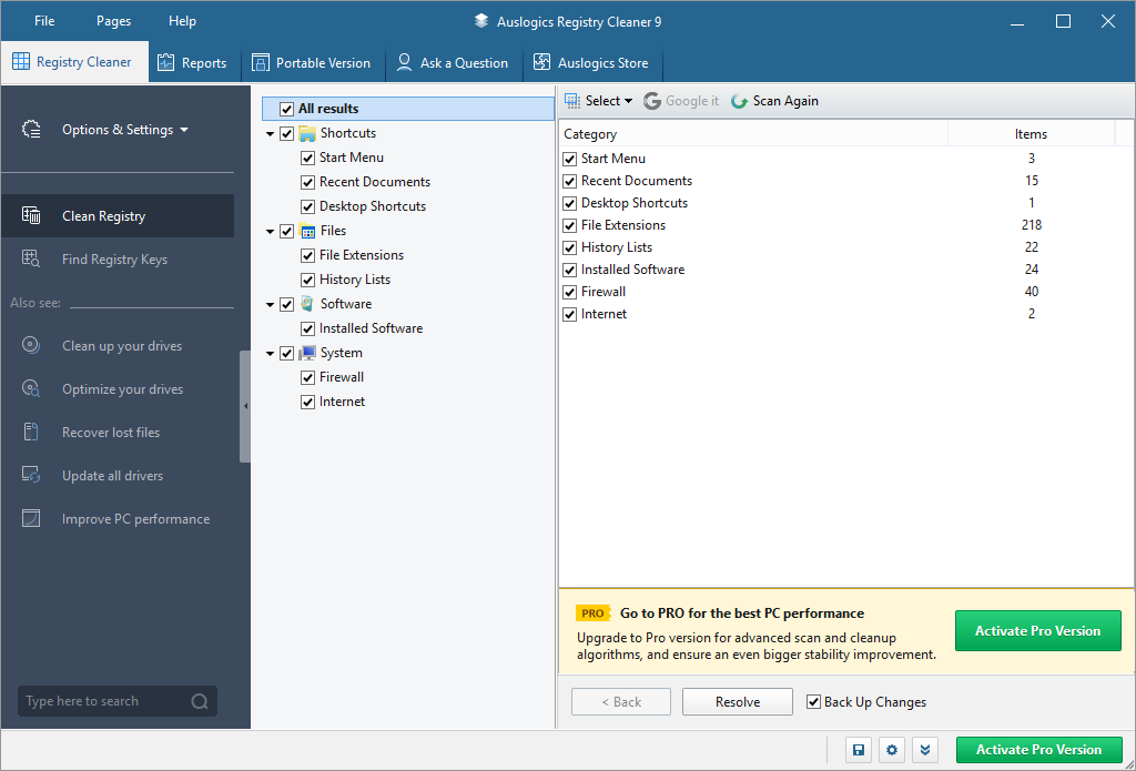 Con la versión gratuita de Auslogics Registry Cleaner, puede limpiar accesos directos a programas rotos, extensiones de archivo, inicio rápido, accesos directos de escritorio, eventos de aplicaciones, rutas de aplicaciones, aplicaciones de inicio, cortafuegos e Internet.
