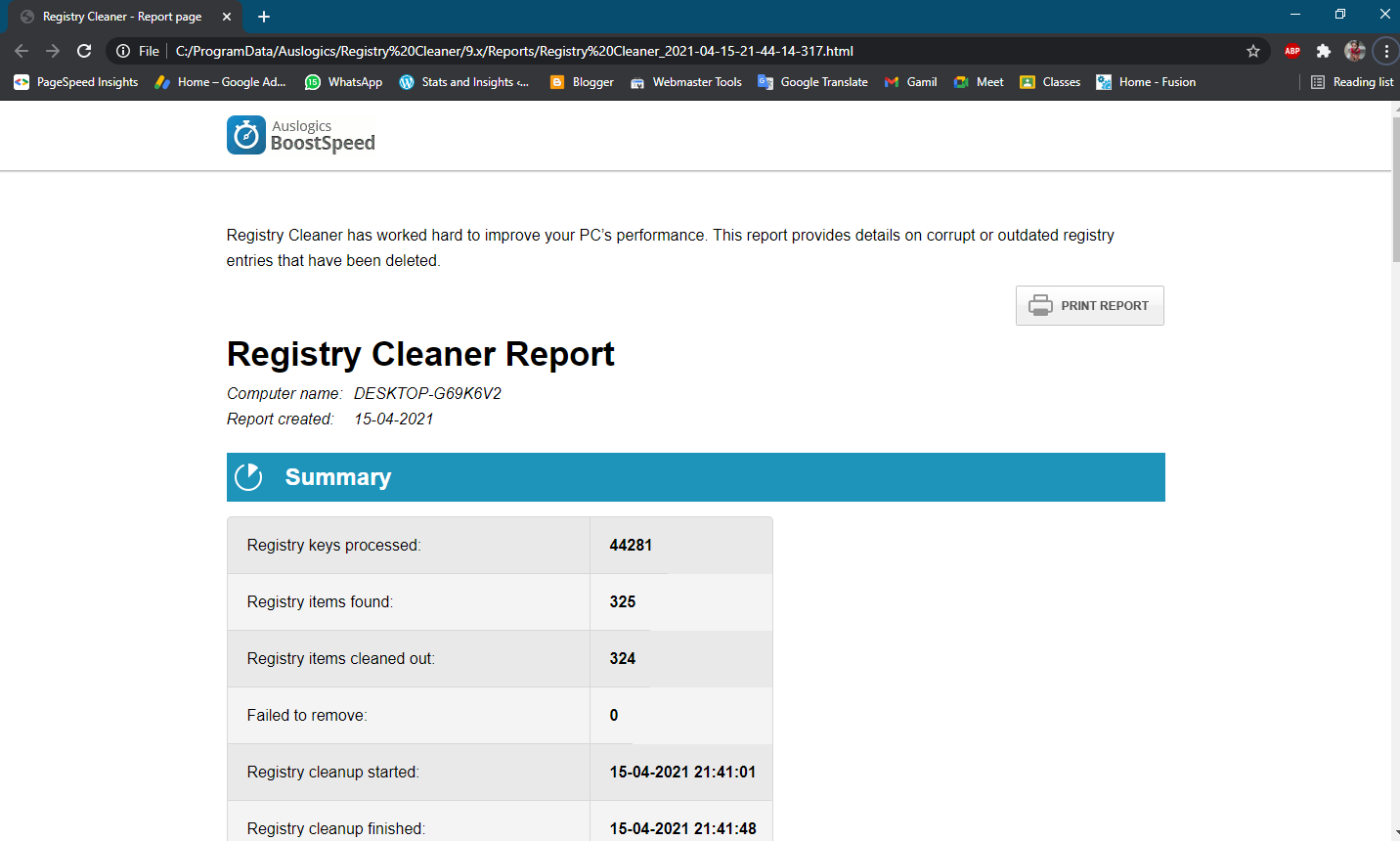 En el informe del limpiador de registro, puede ver la fecha del informe, un resumen de las claves de registro a las que se accedió, los problemas encontrados, los problemas resueltos, etc. También hay una opción disponible en el informe para realizar una impresión para referencia futura.