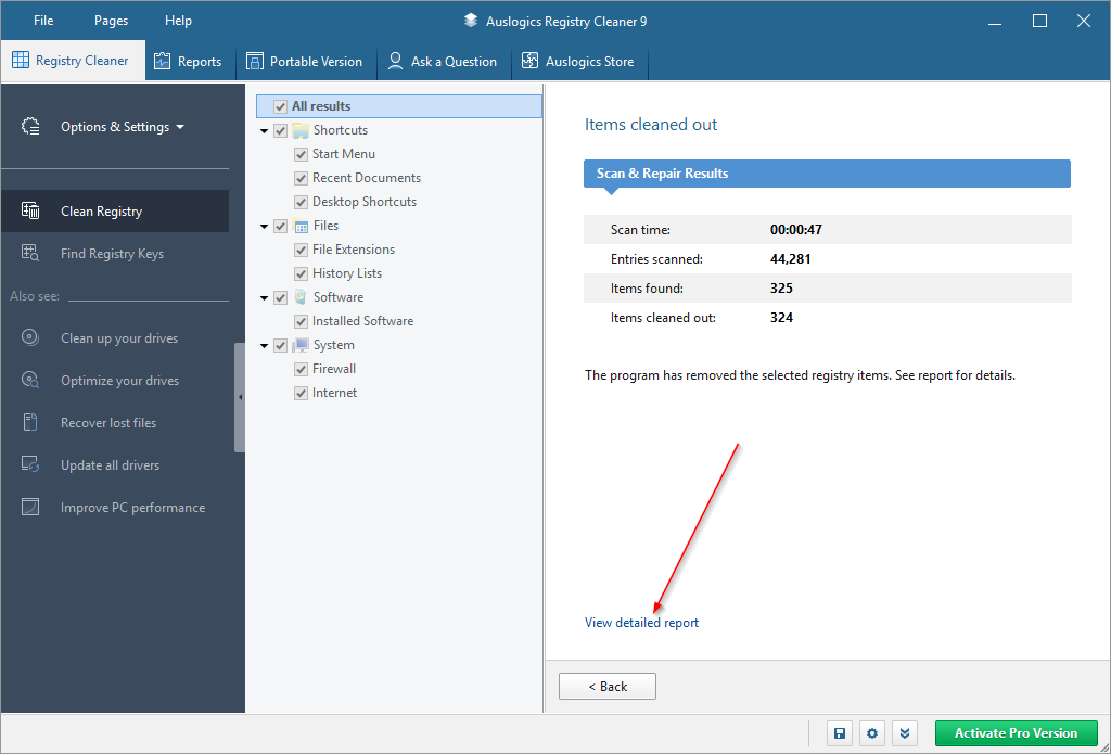 Una vez que limpie los archivos de registro dañados o no deseados, generará un Informe de limpieza del registro. Puede acceder al informe haciendo clic en el enlace “Ver informe detallado”.