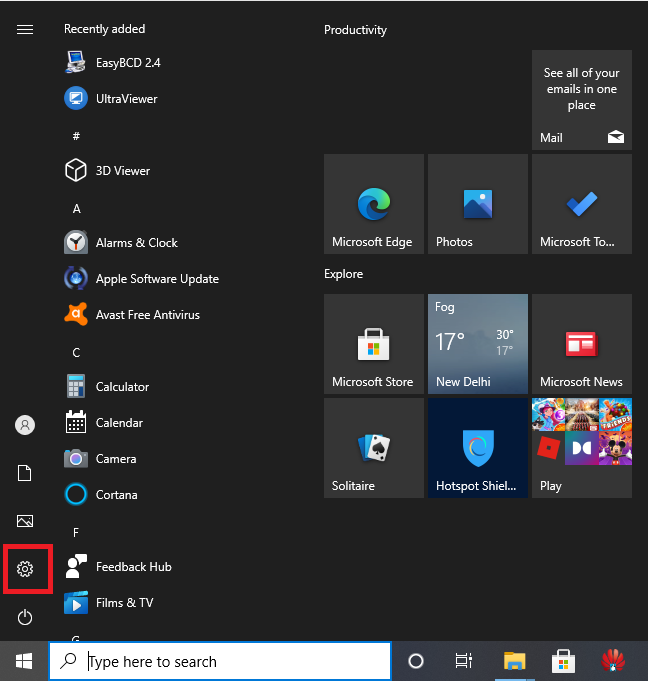 Paso 1. Abra el Ajustes aplicación (para abrir la aplicación Configuración, haga clic en el menú de inicio y luego haga clic en el Icono de configuración).