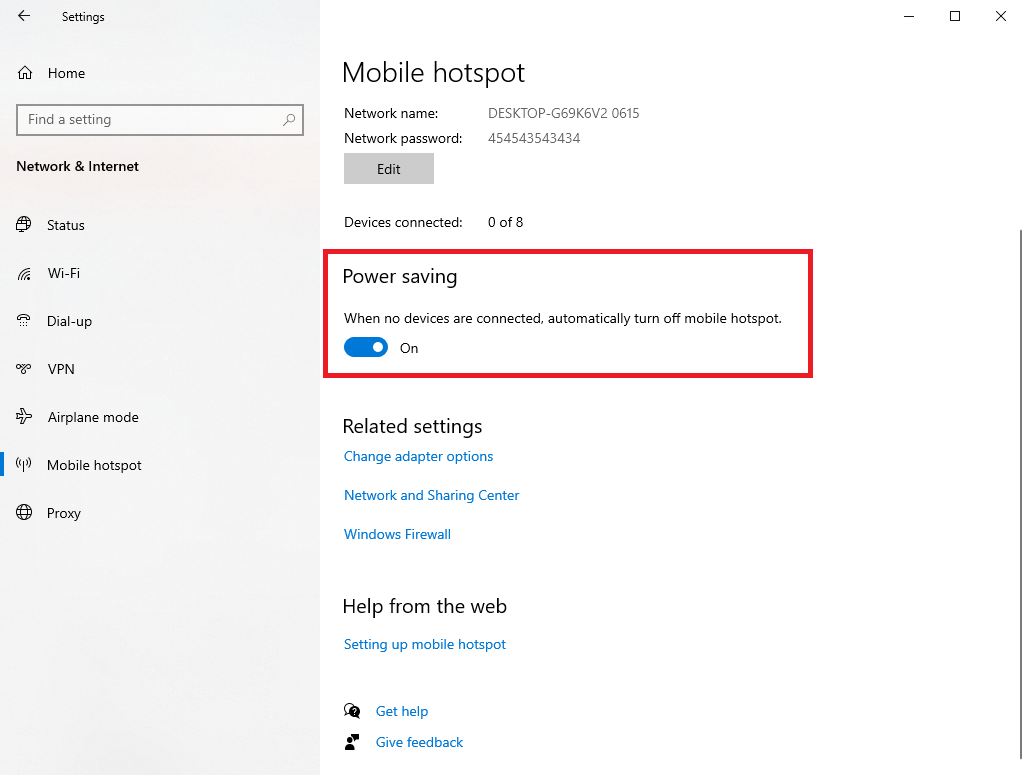 Active “Ahorro de energía” si desea apagar automáticamente el punto de acceso móvil cuando no hay dispositivos conectados a través de su PC.