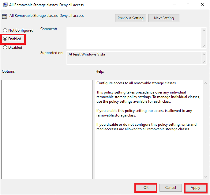 Para habilitar el acceso de medios extraíbles, en el paso 6, seleccione el No configurado opción.