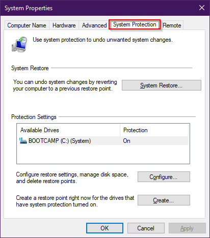 Nota: Los Punto de restauración del sistema La función es independiente para todas las unidades de su PC. Debe repetir los pasos para cada unidad.