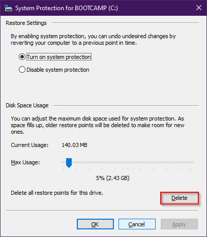 Nota: Eliminar puntos de restauración es seguro, pero recuerde que no podrá restaurar su PC a una fecha anterior sin un Punto de restauración del sistema. Recomendamos mantener al menos un punto de restauración del sistema o crear inmediatamente un nuevo punto de restauración del sistema después de eliminar todos los puntos de restauración del sistema.