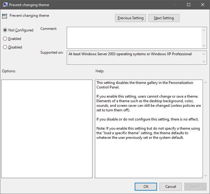 Nota: Prohibir los cambios de tema en su PC con Windows no impedirá que los usuarios cambien los fondos de pantalla. Cualquier cuenta de usuario en su computadora aún puede cambiar el fondo de pantalla.