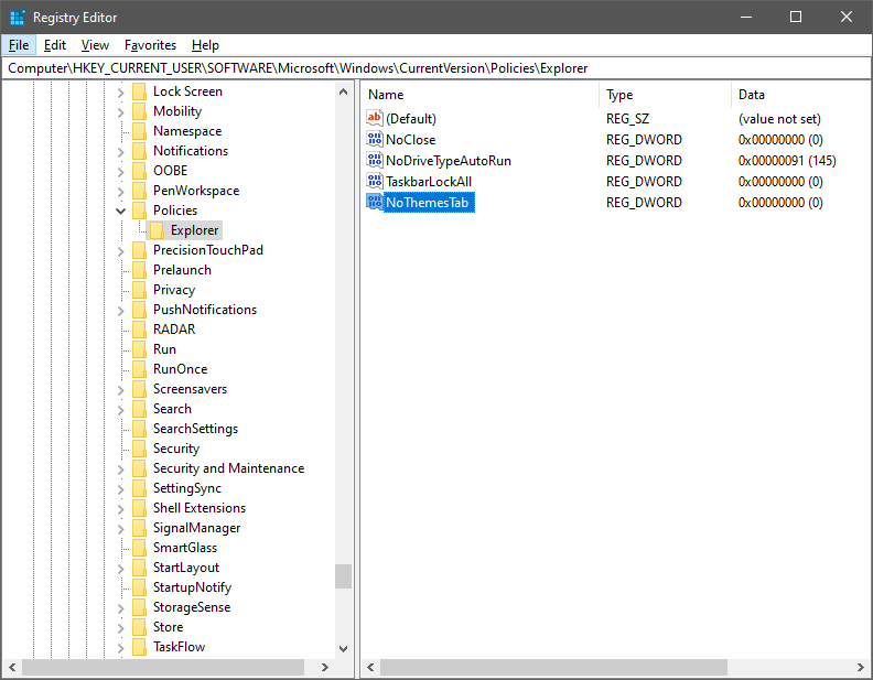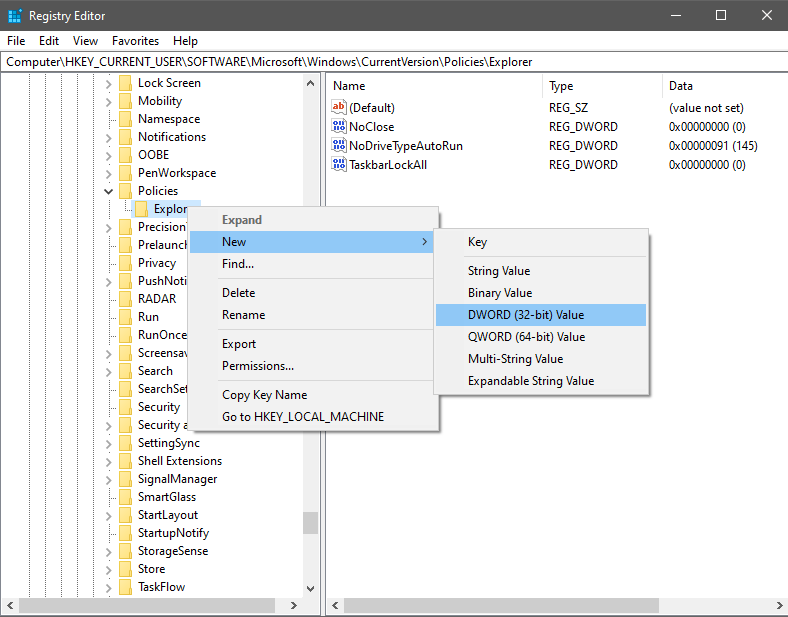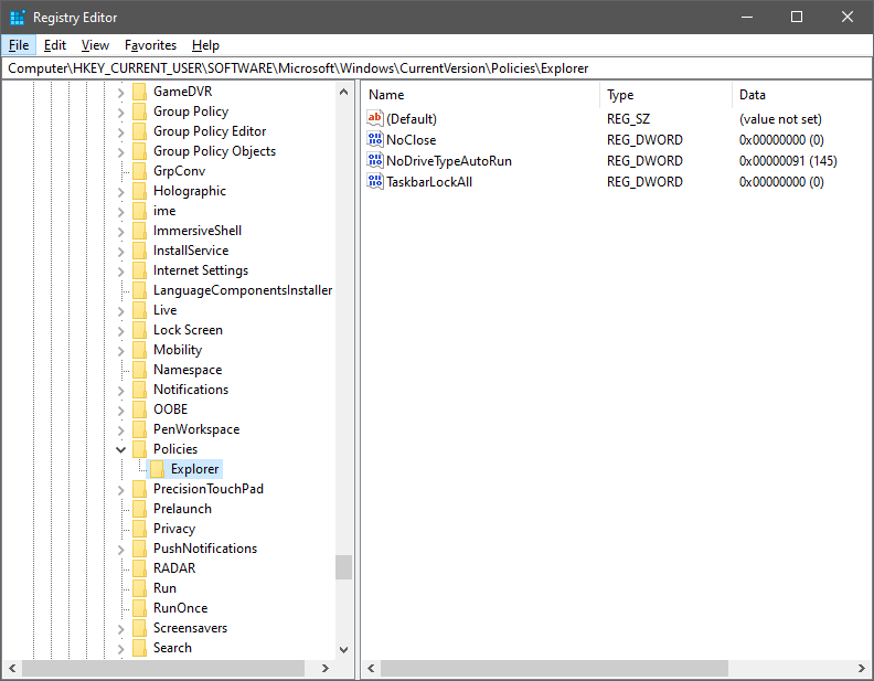 HKEY_CURRENT_USERSoftwareMicrosoftWindowsCurrentVersionPoliciesExplorer