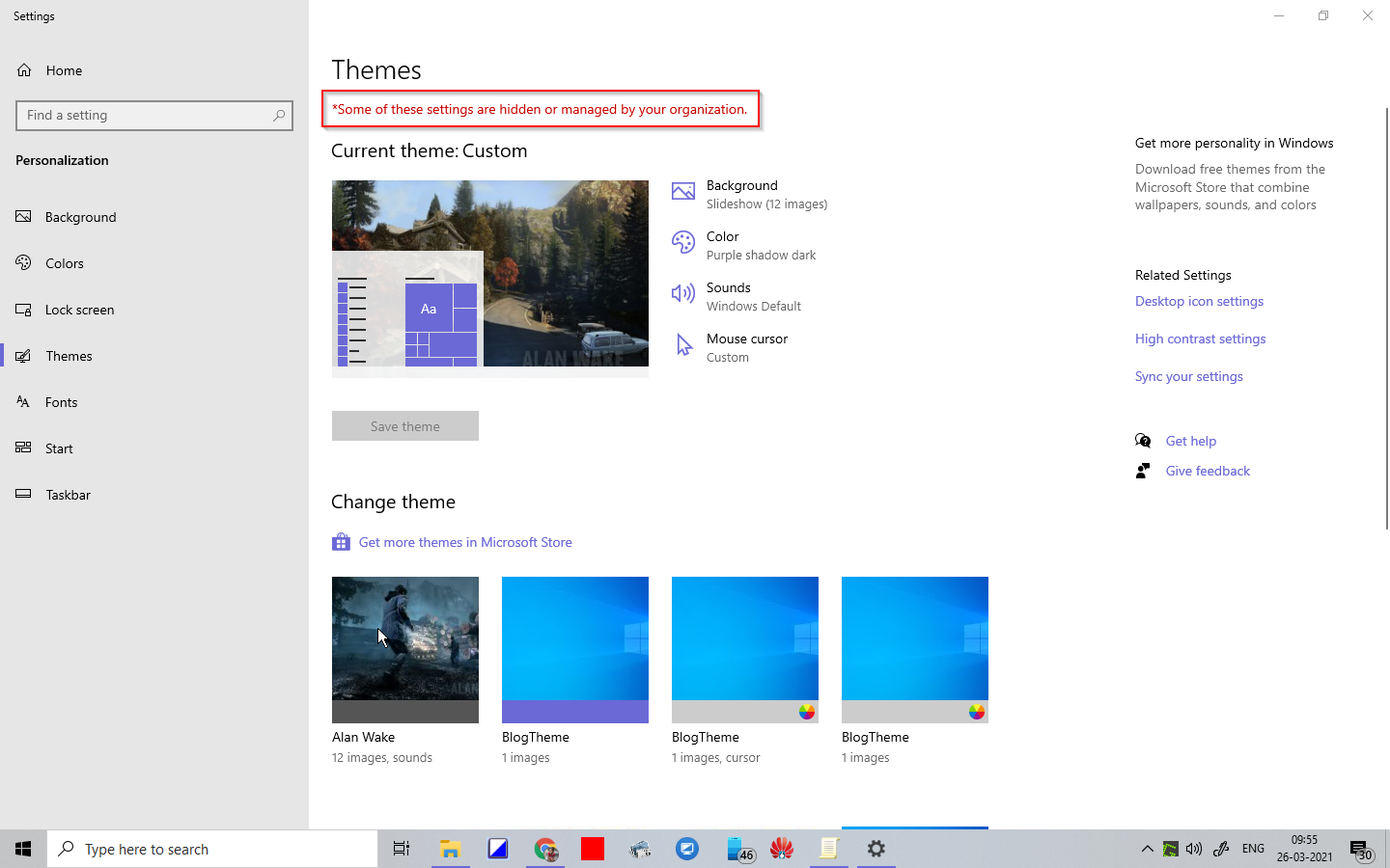 También puede acceder a Temas en Windows 10 haciendo clic derecho en el Escritorio y seleccionando Personalizar, luego haciendo clic en Temas subcategoría. Verá el mensaje “Algunas de estas configuraciones están ocultas o administradas por su organización”.
