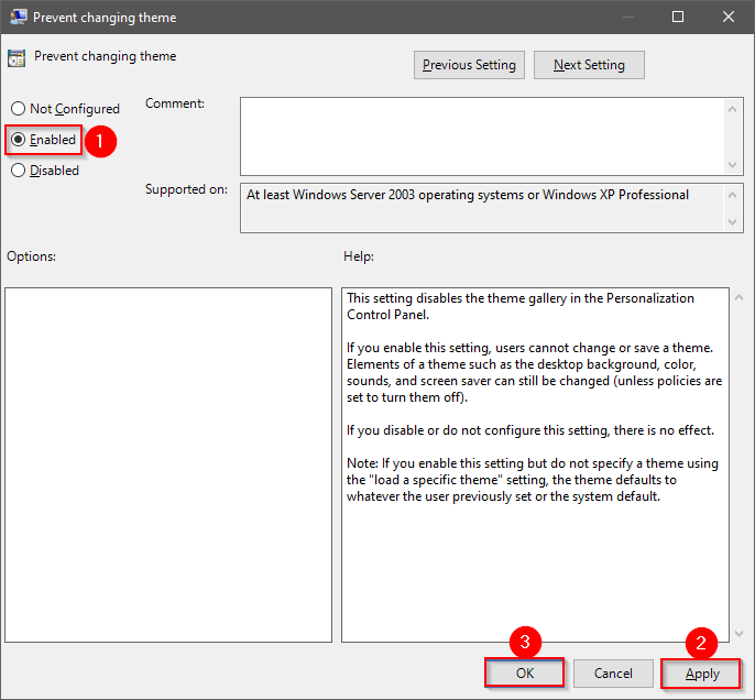 Si desea revertir los cambios, lo que significa que desea permitir el cambio de tema, seleccione la opción “No configurado” en el anterior paso 5.