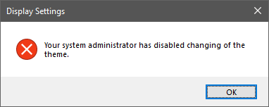 Una vez que complete los pasos anteriores, intente cambiar el tema en su PC con Windows haciendo doble clic en cualquier archivo .deskthemepack. Recibirá el siguiente mensaje de error, “El administrador del sistema ha inhabilitado el cambio de tema”.