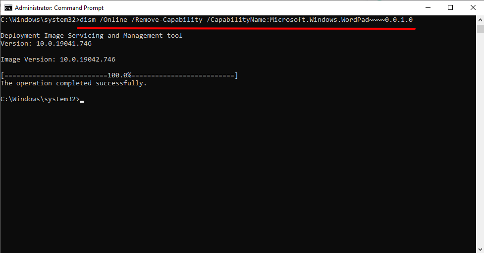 dism /Online /Remove-Capability /CapabilityName:Microsoft.Windows.WordPad~~~~0.0.1.0