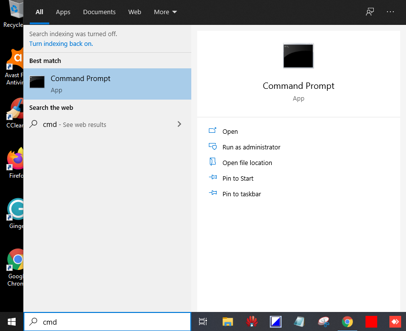 Para abrir el símbolo del sistema con privilegios administrativos, haga clic en el Menu de inicio y escriba cmd.