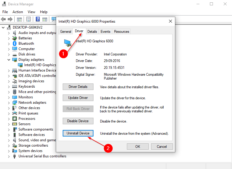 Paso 3. En el Propiedades ventana que aparece, haga clic en el Conductor pestaña. En el Conductor pestaña, haga clic en el botón “Desinstalar dispositivo” para eliminar el controlador de gráficos por completo.