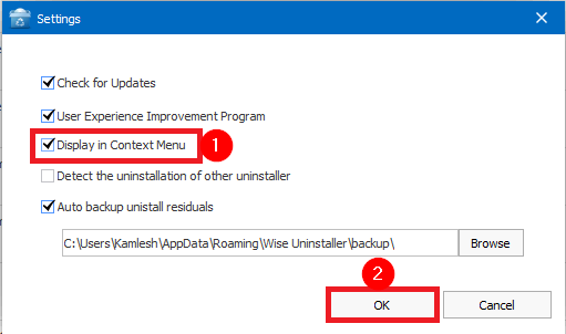 Desde la configuración del desinstalador de programas Wise, puede integrar este programa para hacer clic con el botón derecho en el menú contextual para desinstalar el programa de escritorio de su PC rápidamente. Para hacerlo, acceda a la Configuración del desinstalador de programas Wise, marque la casilla de verificación “Mostrar en el menú contextual” y luego haga clic en el botón Aceptar.