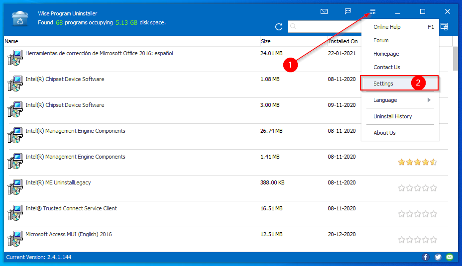Puede acceder a la configuración del programa Wise Program Uninstaller haciendo clic en el menú icono y seleccionando el Ajustes opción.