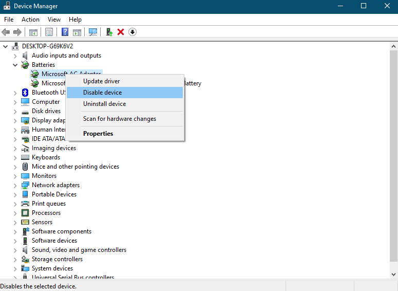 Paso 4. Haga clic derecho en Adaptador de CA de Microsoft y seleccione Desactivar dispositivo. Ahora, vuelva a hacer clic derecho sobre él y seleccione Habilitar dispositivo.