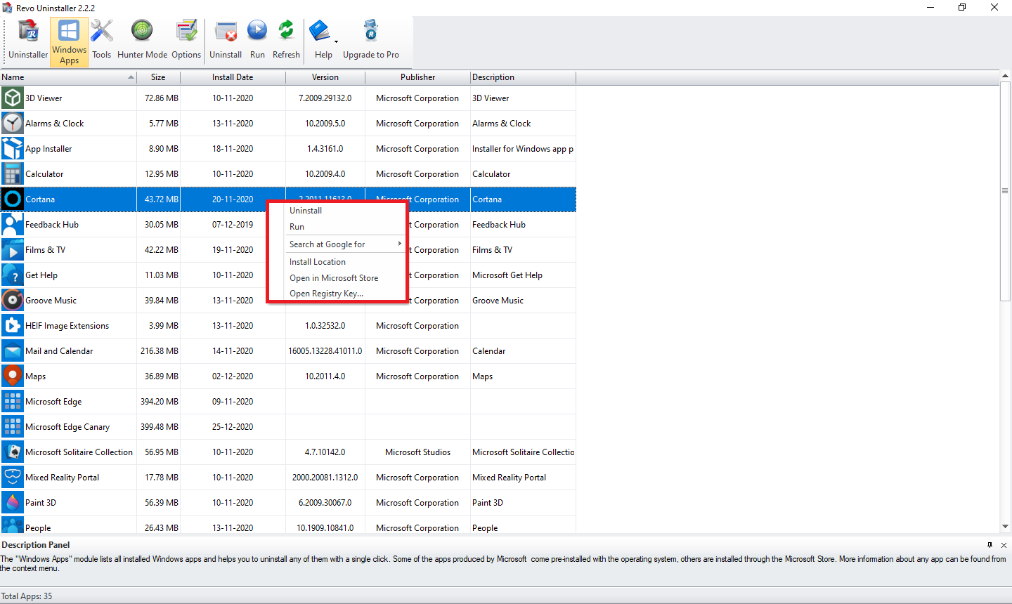 La instalación de aplicaciones de Microsoft Store es diferente a la del software normal. Puede eliminar fácilmente las aplicaciones de Microsoft Store con Revo Uninstaller. Similar a EXE, puede hacer lo siguiente con las aplicaciones de la Tienda Windows: –