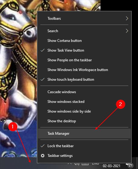 Paso 1. Inicie el Administrador de tareas haciendo clic derecho en un lugar vacío en la barra de tareas y luego seleccionando el Administrador de tareas opción.