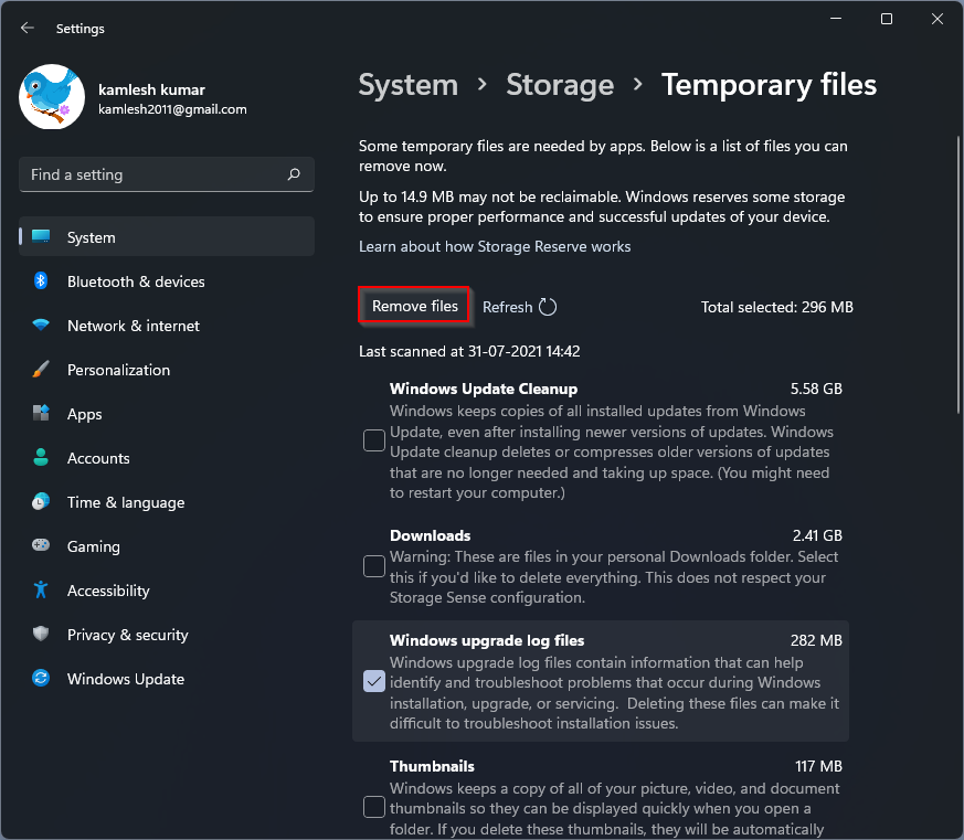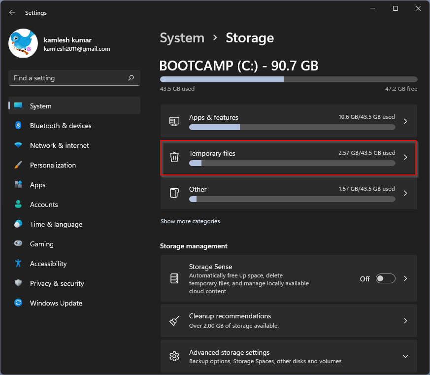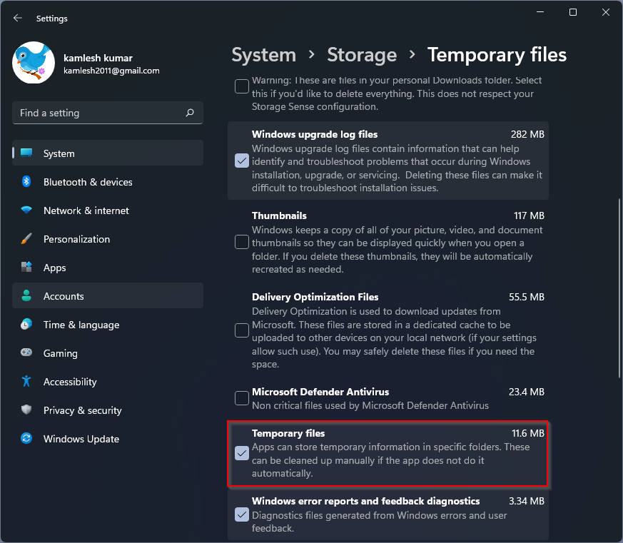 Con la poderosa aplicación de Configuración, también puede borrar los archivos de caché temporales en Windows 11.