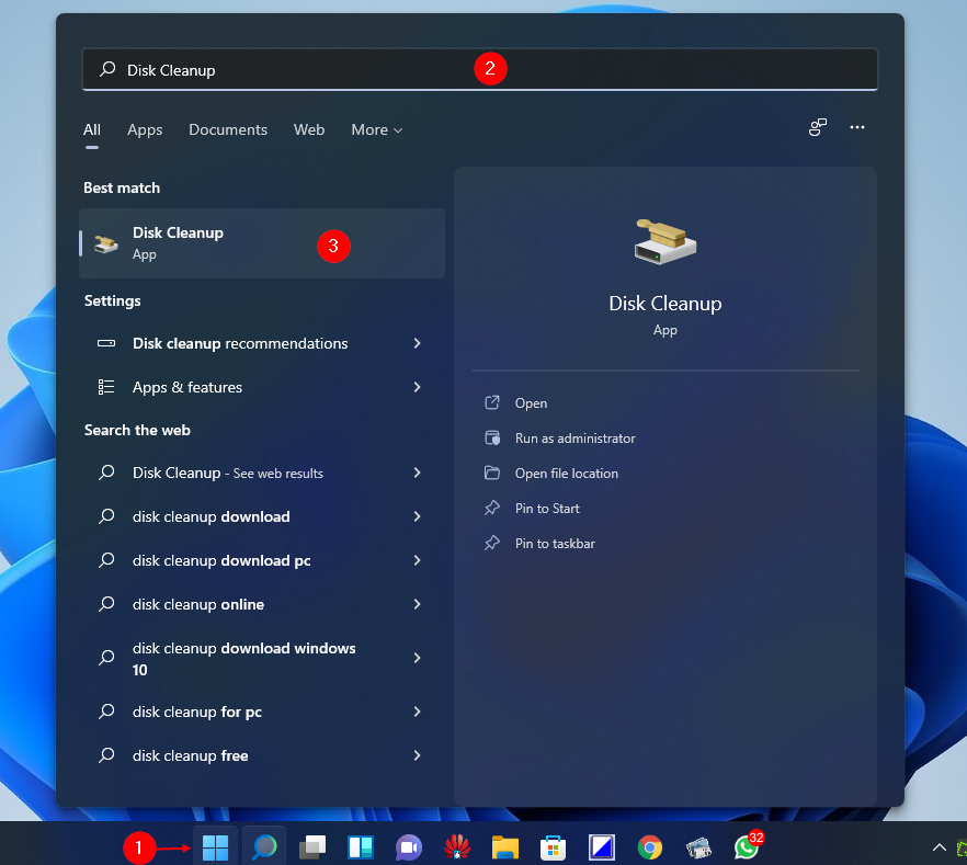 Paso 1. Haga clic en el Comienzo botón de la barra de tareas y luego escriba Limpieza de disco en el cuadro de búsqueda.