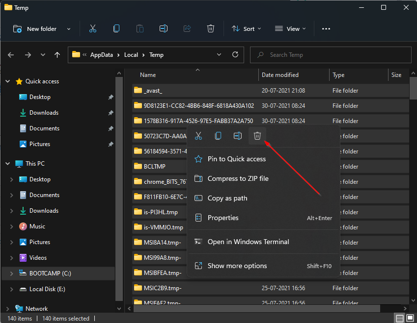 Paso 3. Después de realizar los pasos anteriores, el Temperatura se abrirá la carpeta. Seleccione todos los archivos y carpetas y luego haga clic derecho sobre ellos para seleccionar el Borrar icono.
