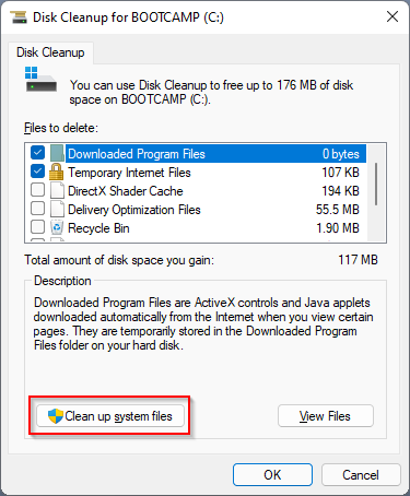 Si no está seguro de en qué unidad está instalado Windows 11, también hay una opción separada disponible para eliminar los archivos del sistema; para eso, haga clic en el Limpiar archivos del sistema botón. Seleccionará automáticamente la unidad del sistema.