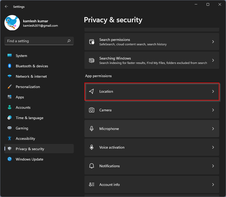 Paso 3. En la ventana del lado derecho de Privacidad y seguridad, desplácese hacia abajo para ver el Localización opción y luego haga clic en ella para abrir.