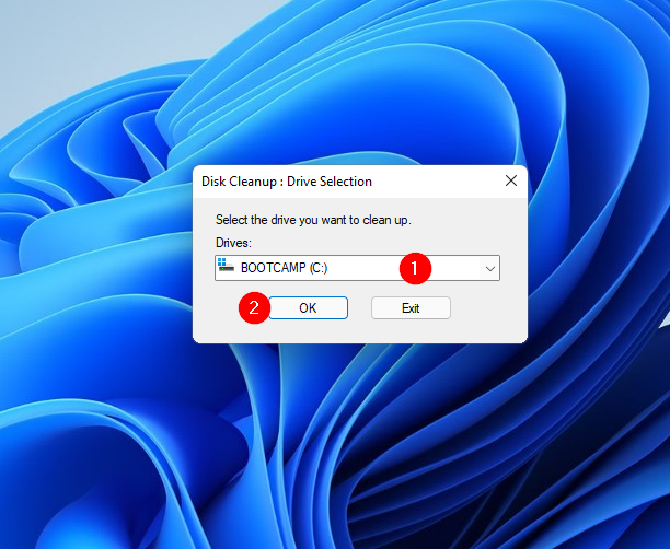 Paso 2. En los resultados de búsqueda disponibles, haga clic en el Limpieza de disco aplicación para abrirla. Se le pedirá que seleccione una unidad. Seleccione la unidad (normalmente la unidad “C”) donde está instalado Windows 11 en el menú desplegable. No, haga clic en el OK botón.